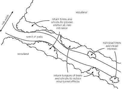 We need to cut back the trees and scrub to make a three metre wide path. Ideally this needs to be curving from left to right in gentle arcs to stop any wind-tunnel effect that we might get if we have a straight run, and allows us to incorporate any wet or boggy areas which are so important for wildlife. It also makes it a more interesting walk and we can keep a dense sandwich of trees between the greenway and the new road.