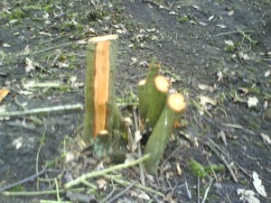 I know it’s a pain and I keep banging on about it. But if we cut the trees down at ground level, it will save having to cut them again, or worse people tripping over them, or even worse the brush-cutter hitting them when they start to sprout shoots and breaking.