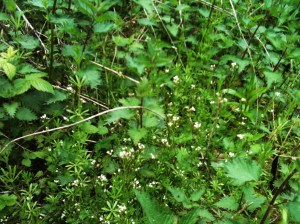 Don’t know what these white flowers are and really need to take the book down with me to identify them. See the nettles around them that need to come away.