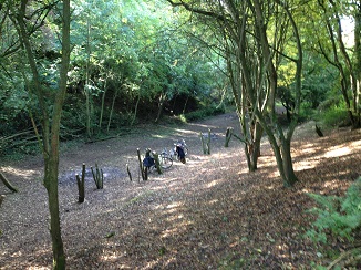We can see the stumps in this picture. I reckon we can get rid of three with each fire. There is still loads of brash on the other side of the path, and we need to take a load more trees down on this side. The sunlight is starting to hit the ground. In the summer the sun is higher in the sky, rather that behind the trees and creating the dappled sunlight.