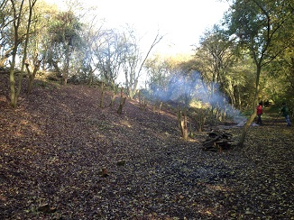 Chris, Mike, Aaron, Mick and myself got a fire going really quickly and half of us brought down some trees whilst the other half of us stripped and burned the brash, and also dug out a load of old brash.