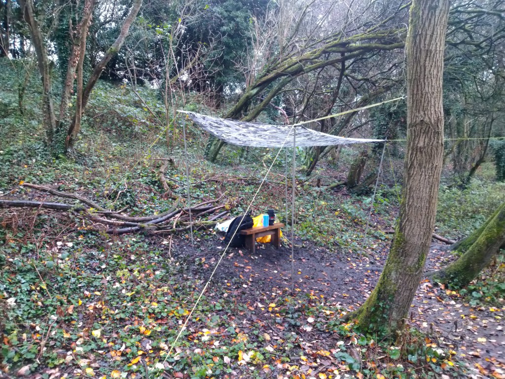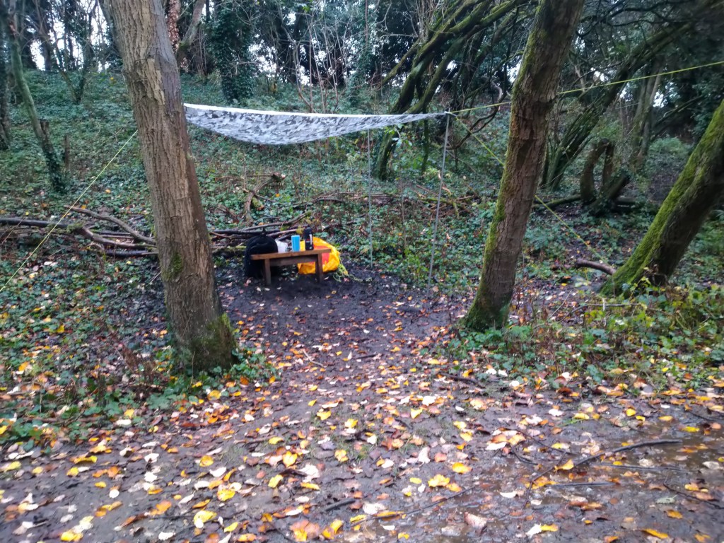 It is always terrific fun when we put up our den. A mixture of the hilarity of trying to put the thing up, and the schoolboy satisfaction that we have made a den in the woods and now have a camp.