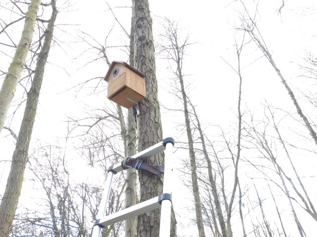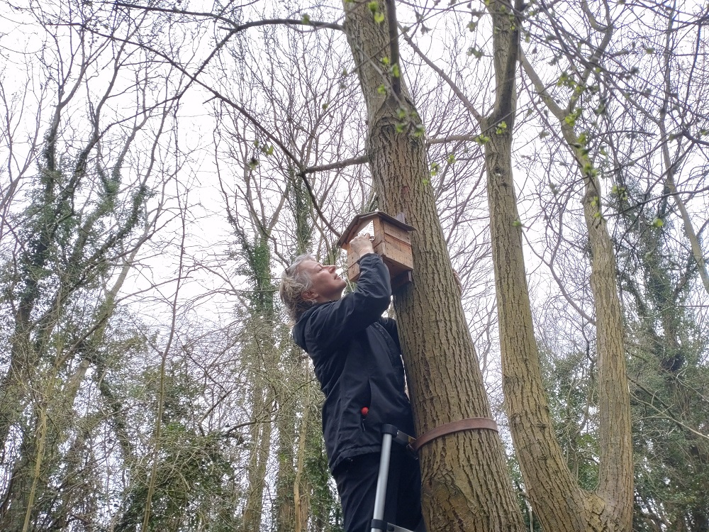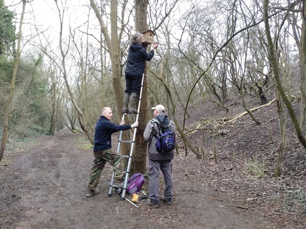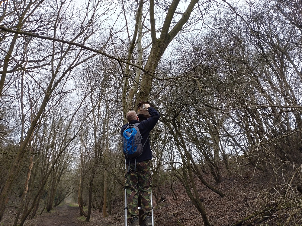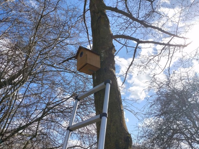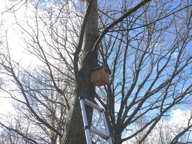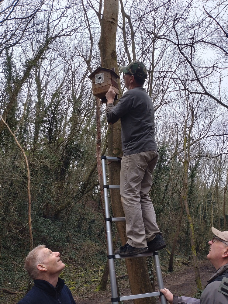 We have five nesting boxes around The Bear pub access. Two to the north and three to the south. They have been wrecked by the woodpeckers so we needed to get our metal plate protectors in place. Easier said than done!!