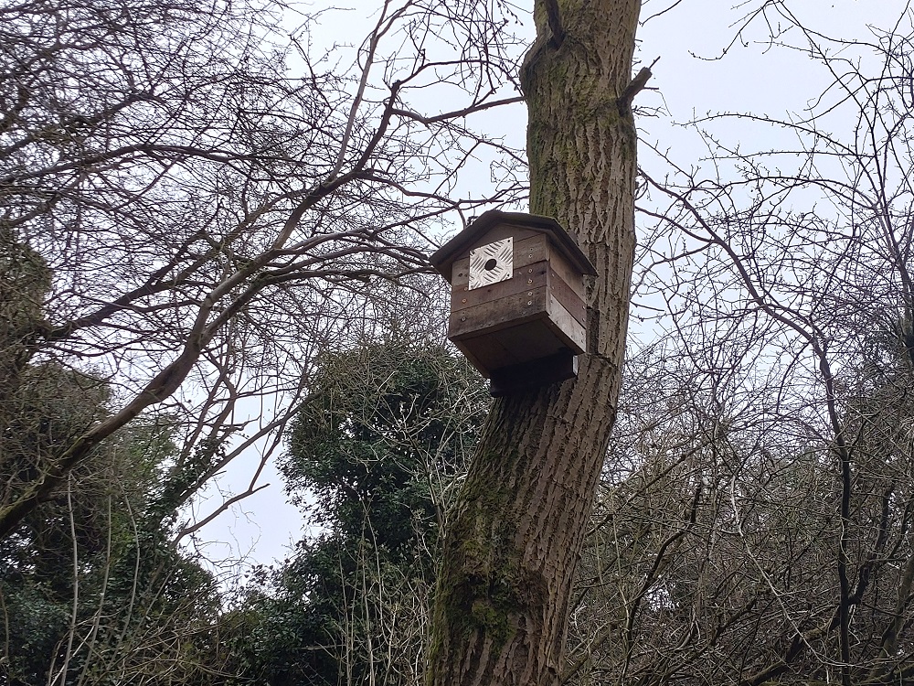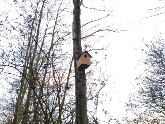 We have eight bird nesting boxes up on the section south of the birdfeeder clearing. Two are rescue boxes that have been attacked by woodpeckers, and six are new boxes. They are high up and all face a north to easterly direction to keep the blazing spring sun from cooking the inside of the boxes and, the harsh south-westerly winds at bay. RSPB suggest nesting boxes are at least eight metres apart.