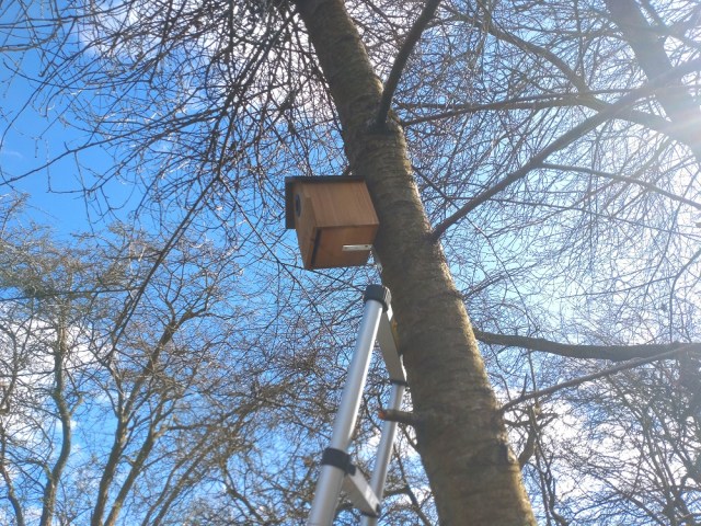 Luckily, no accidents (the ladder is attached to the tree) and nice to see a pair of great tits checking out the first nesting box as we worked on the others.