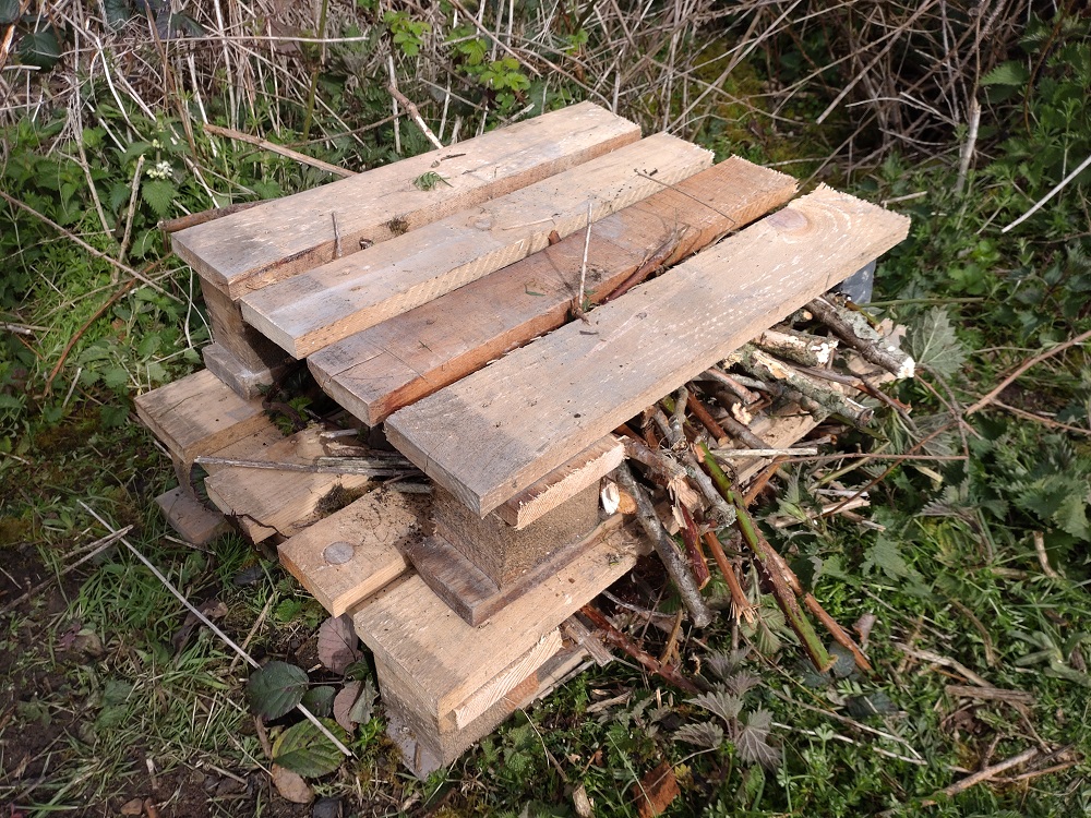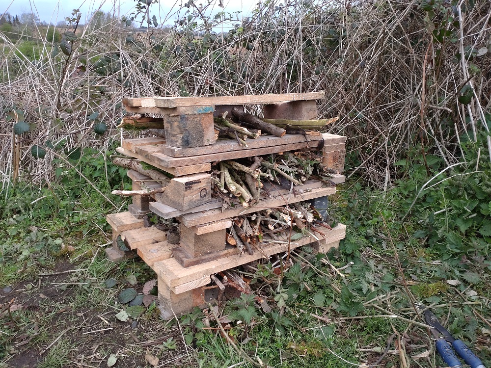 We finally got a pallet onto the path (long story!!!) and made it into a “bug hotel”. It is just a densely packed space with the ability for insects to travel up and down as well as back and forth.