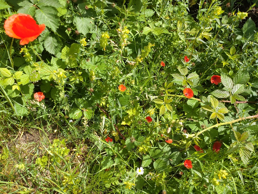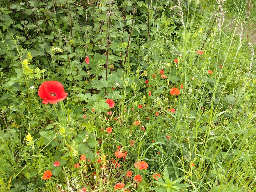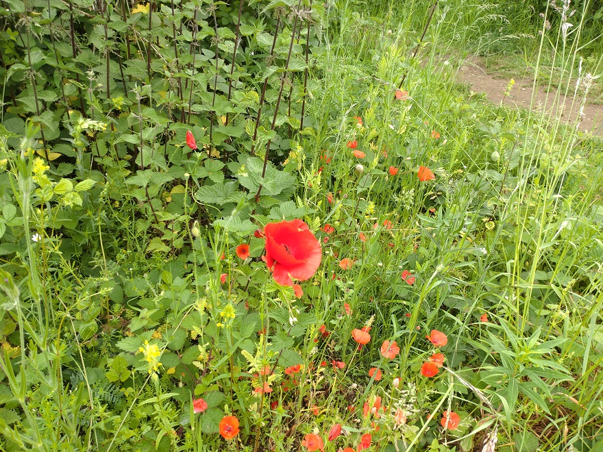 Poppies – if you cast your mind back to last year, you will remember that I harvested what felt like a million poppy seeds from a field next to the Dunchurch Bridleway (another trail that I have been working on). It connects to Cawston Greenway at one end and National Cycle Network 41 at the other, so it’s our umbilical cord to the Mothership. Anyway, Marcus and me spent ages putting the poppy seeds in, along with loads of others, in the autumn of last year.