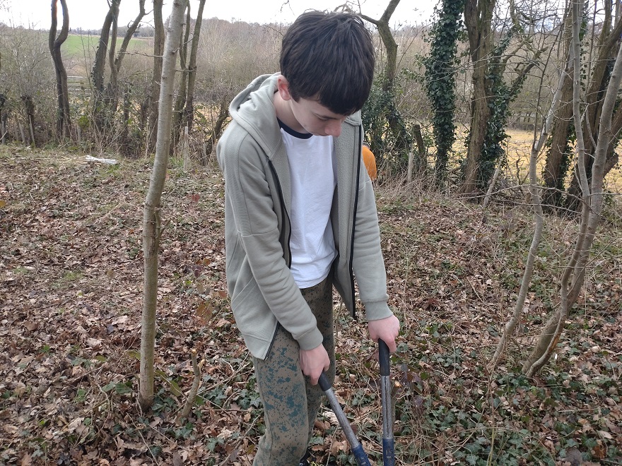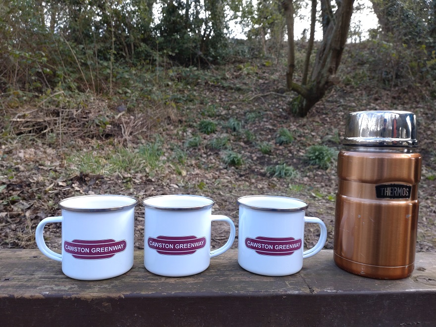 We also did a litter-pick from the bird-feeder glade to the underpass, finished our temporary path, to create an alternative to the treacherous “nutcracker” slope down the side of the bridge, and enjoyed a cuppa and cookie using our new mugs.