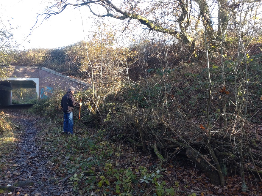 Today we met at the halfway point at the underpass and pushed in both directions. The southern push was to try and re-tame our hawthorn hedge, and also to see how far we could get with a battery-powered strimmer.