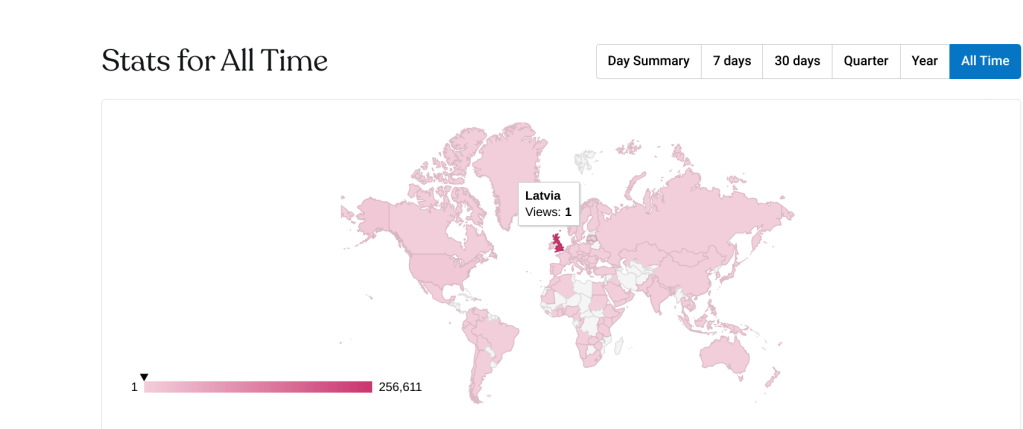 Someone from Latvia dropped by. That’s 126 countries now. It’s probably a bit like collecting stamps. Totally boring and pointless to everyone except those who do it. But it is just a tincy wincy bit addictive though.
