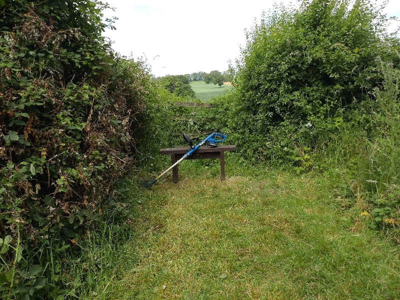 Today five of us met and carried on with keeping the path wide so people can walk side-by-side and have a conversation, or mountain bikers and walkers can pass each other without the walker having to leap into the scrubby margins and suffer stinging nettle stings and bramble clawing at their legs.