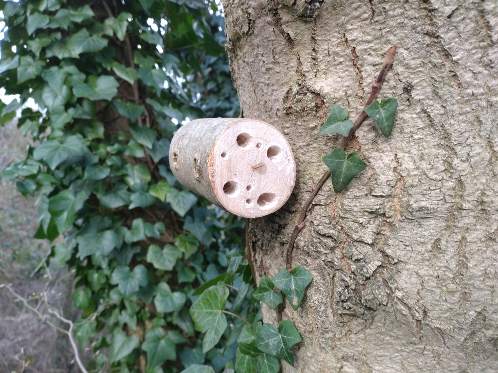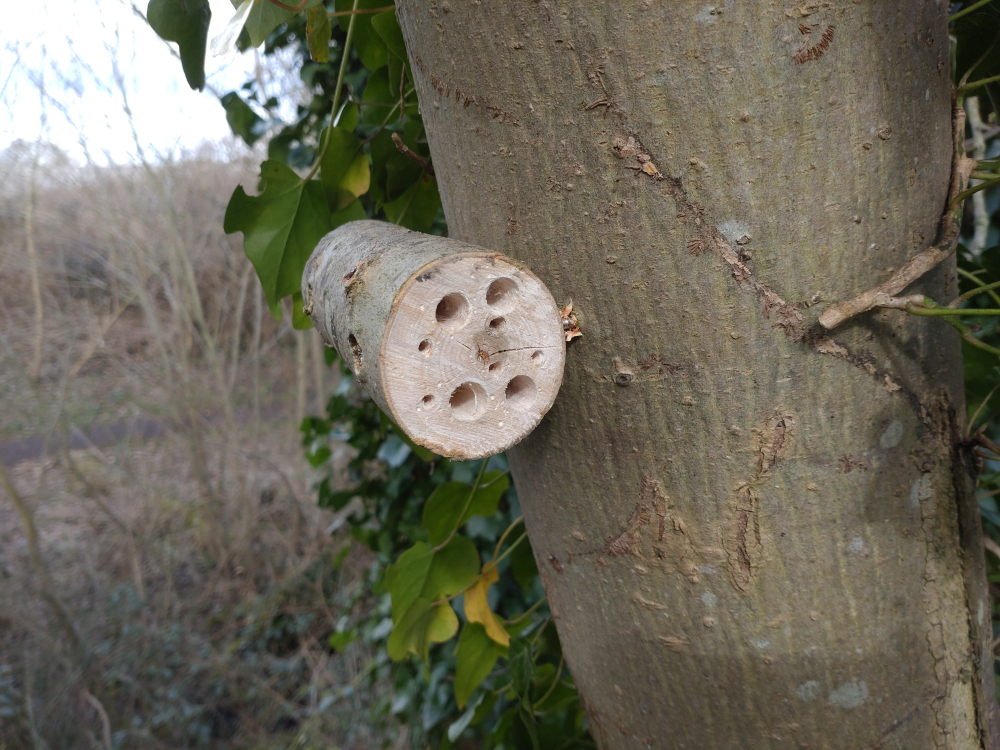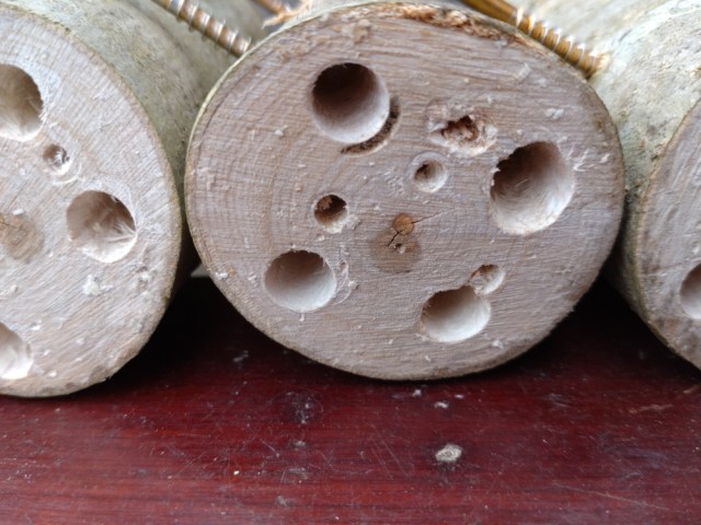 The holes need to be between three and four inches deep and between 6mm to 10mm in diameter. We need to attach them to the side of trees with the entrance facing south to get full sun, and then see what happens.