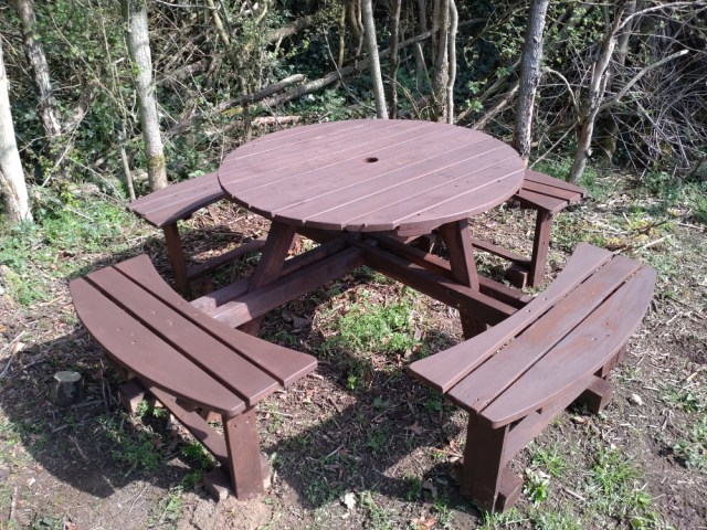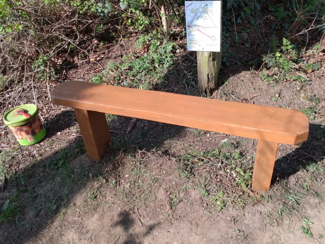 Riddled with guilt and burdened with a deep sense of shame, I chomped through my delicious breakfast, before we carried on staining the benches and strimming the path up to the last set.
