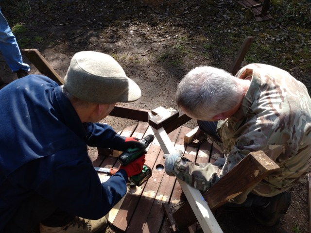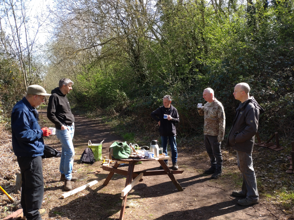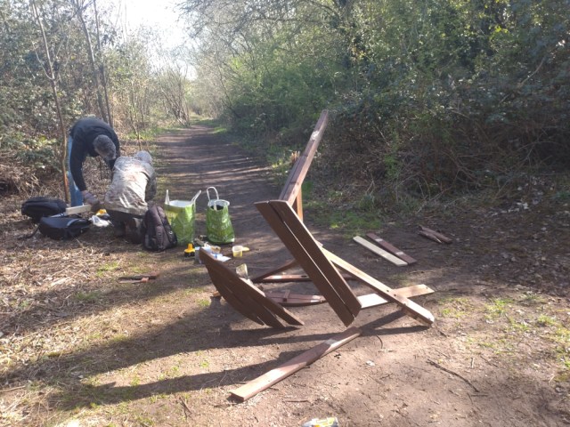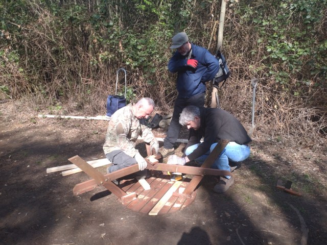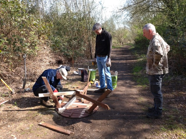 Seven of what I would like to call wildlife superheroes turned out today, but we were far from doing wildlife stuff. Marcus, Ian, Reece, Martin, Steve, Matt, and Paul set about fixing our picnic bench.