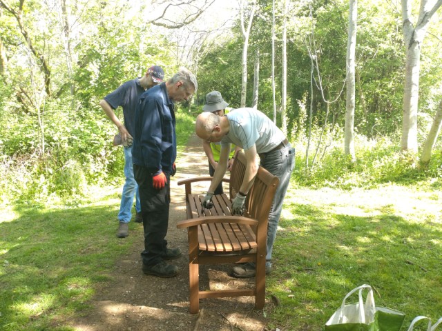 Whilst the five of us wrestled with the bench and bags of postcrete, Steve, Marcus, and Ian carried on with the strimming to stop the vegetation doing a triffid-like invasion of the path.