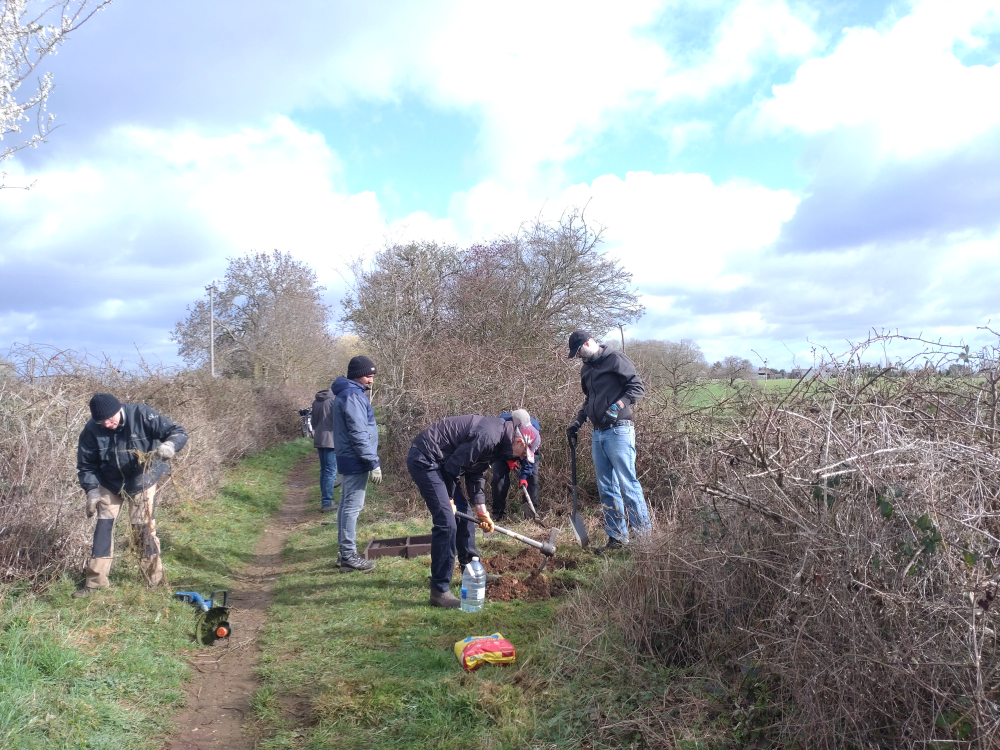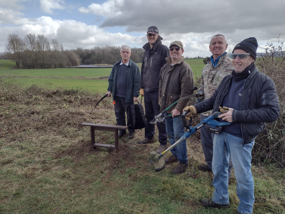 Reece, Dave, Ian, Andrew, Martin, David, Matt, Steve, Mark, Ram, and Paul made it, for some final crown lifting of mature trees before they start to bud up, strim the sides of the path so people can walk two-abreast, and put in a very special bench.