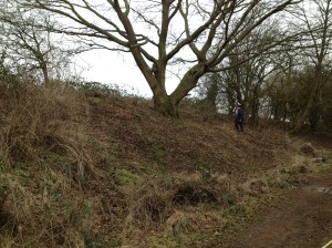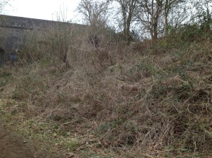 What I am trying to do, is cut scallops into the west bank. Because the path runs north/south on this bit, the south facing bit of each scallop should become a micro-habitat for insects, butterflies and flowers. The clumps of scrub also create a windbreak along the path.